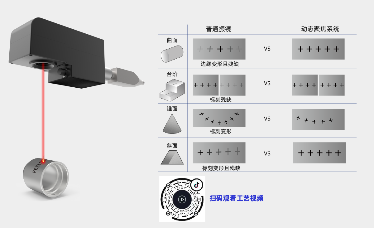 采用动态聚焦系统控制,突破传统打标的维度和幅面限制,可在3D曲面、台阶、锥面、斜面等物件进行无失真标刻。
